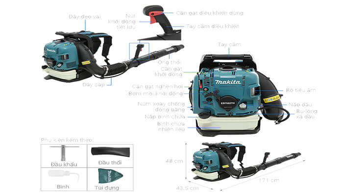 - Máy thổi bụi chạy xăng Makita EB7660TH là máy thổi bụi đeo vai sử dụng động cơ xăng 4 thì dễ vận hành, công suất mạnh với tốc độ thổi 92m/s, phù hợp cho việc thổi bụi cầu đường, thổi bụi công trường, thổi lá sân golf, sân tennis,… Máy thổi bụi cầu đường chạy xăng đeo vai Makita EB7660TH đang là sự lựa chọn số một của các đơn vị thi công cầu đường bởi tính cơ động, linh hoạt, tiện dụng mang lại hiệu quả cao trong công việc.